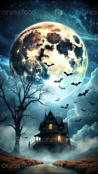 Полнолуние освещает дом с привидениями под звездным ночным небом, наполненным летучими мышами и тусклыми облаками