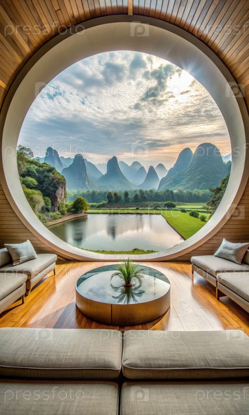 Роскошная гостиная с потрясающим видом на горы и спокойным озером, с современной мебелью и просторной планировкой при закате солнца