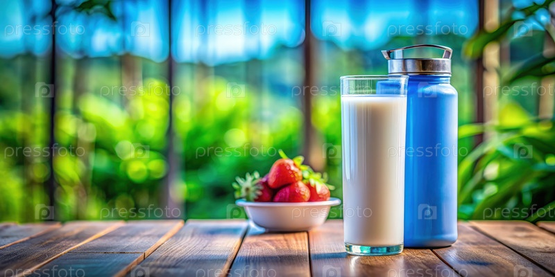 Освежающий стакан молока рядом со клубницей на деревянном столе снаружи