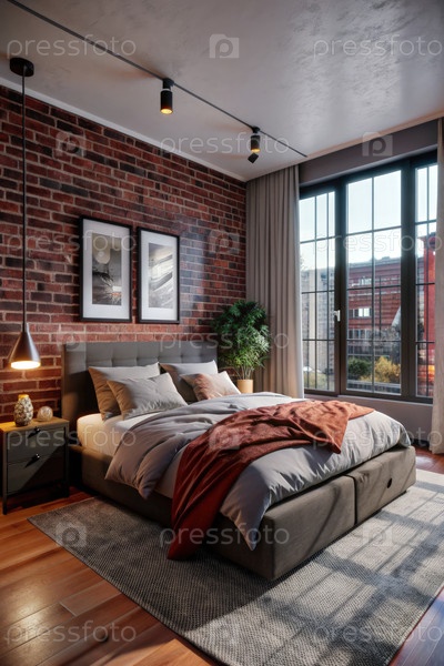 Современная спальня городской квартиры с уютной кроватью, стильным декором, большими окнами и естественным светом в оживленном окружении города