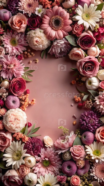 Красивая цветовая аранжировка с различными цветами на мягком розовом фоне на декоративном мероприятии