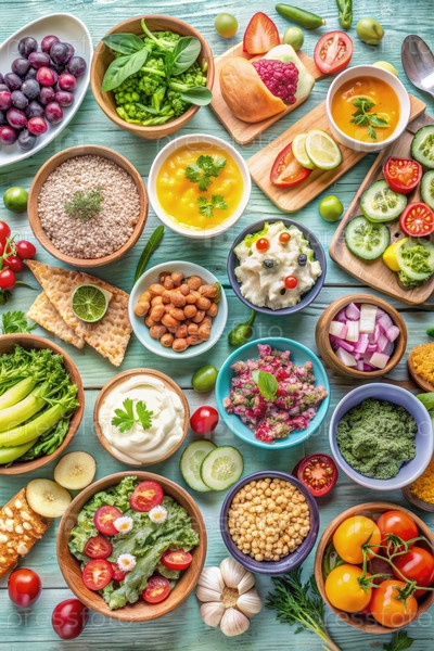 Красочное распространение здоровой и вкусной пищи со свежими ингредиентами, красиво расположенными на деревянном столе