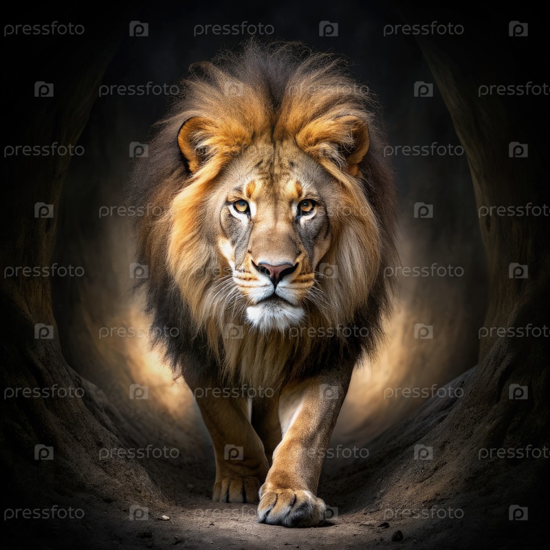Величественный лев, выходящий из тьмы в свет на закате