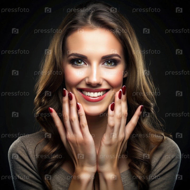 Счастливая женщина с красивыми руками, позирующая на темном фоне