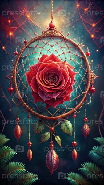 Увлекательная цифровая иллюстрация ловца мечты с ярко-красной розой, украшенной сложными орнаментами, висящей на мистическом звездном фоне