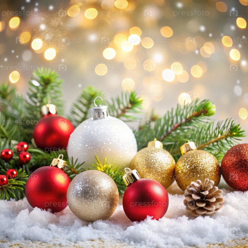 Рождественские украшения с красочными шарами и сосновыми шишками на белом фоне