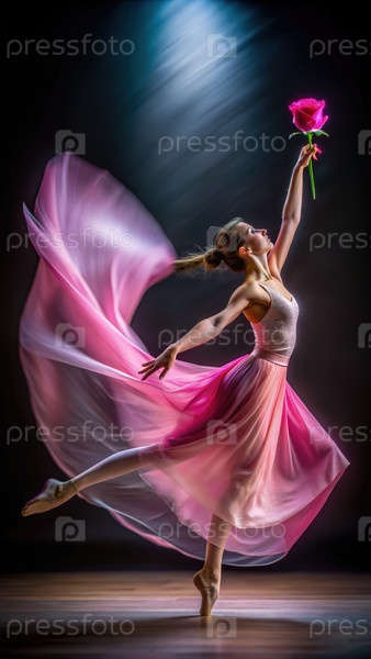 Танцовщица грациозно движется с розовой розу, захваченной в мягком свете