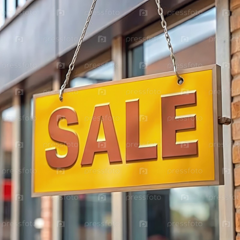 Знак со скидкой, висящий снаружи розничного магазина и объявляющий о сезонных распродажах