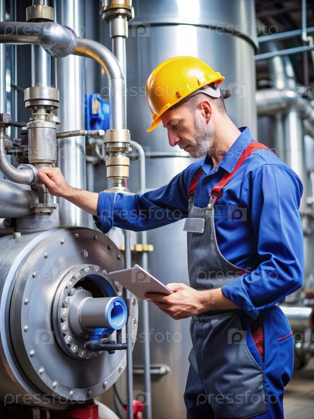 Механик внимательно осматривает котел на промышленном объекте, одновременно проверяя показания на планшете