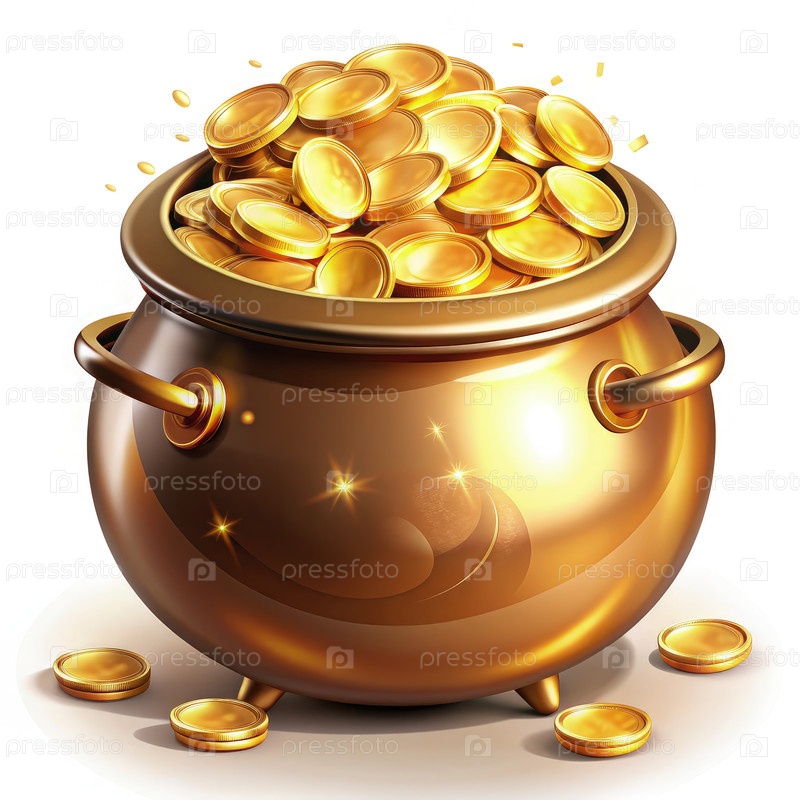 Горшок, переполненный золотыми монетами на белом фоне