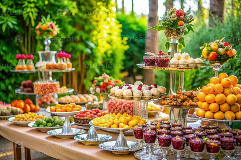 Элегантный настольный дисплей сладостей и фруктов для гостей на садовом собрании