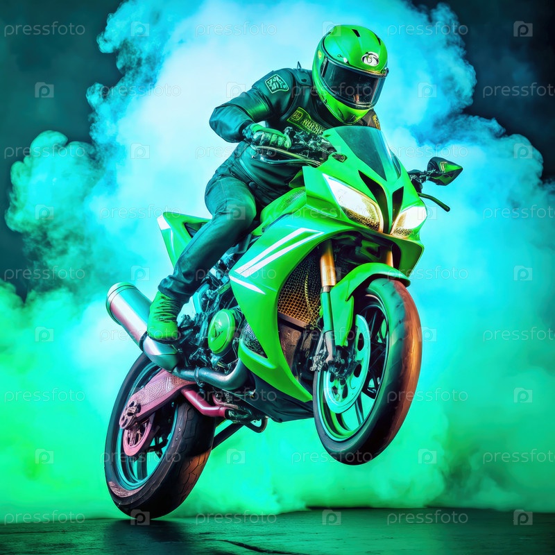 Водитель выполняет потрясающую ходьбу на зеленом мотоцикле в городской обстановке