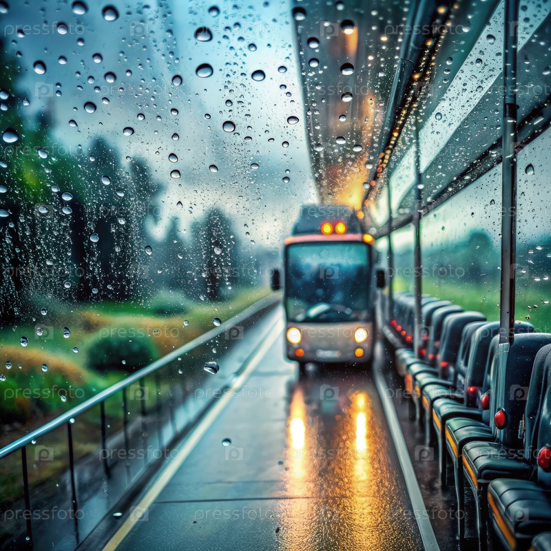 Путешествие на автобусе в дождливую погоду с капельками воды на окне