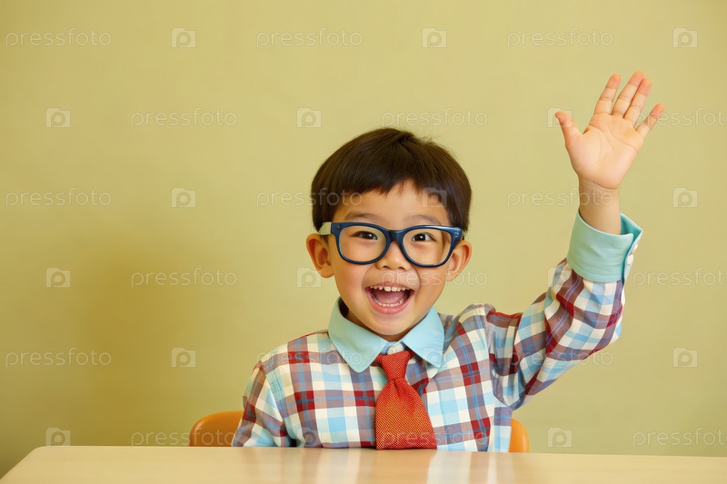 Ученик начальной школы в очках с энтузиазмом поднимает руку во время занятий
