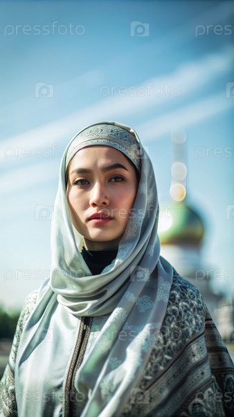 Молодая казахстанская мусульманка в традиционной одежде на солнечном фоне