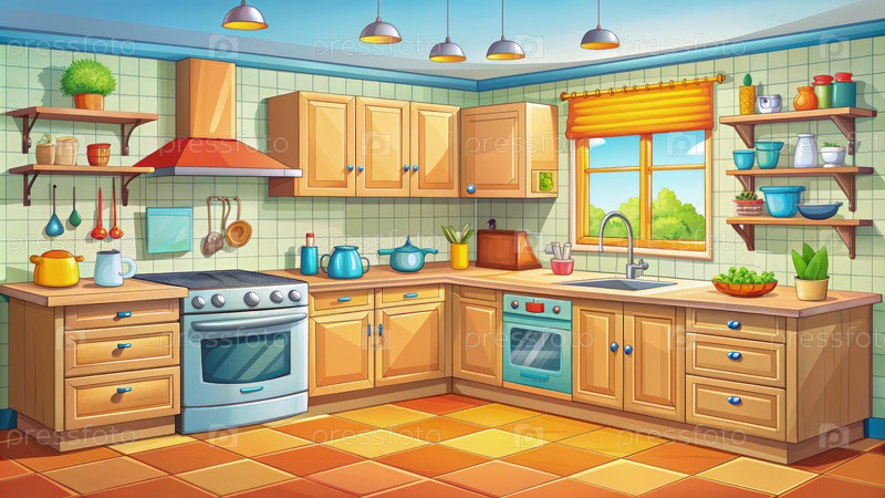 Яркая мультфильмовая кухня с шкафами, плитой и свежими травами в солнечной обстановке