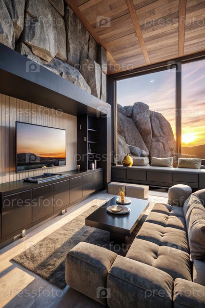 Современная гостиная с большим окном, демонстрирующим потрясающий закат солнца над скалистой местностью и гладкой мебелью для уютной атмосферы