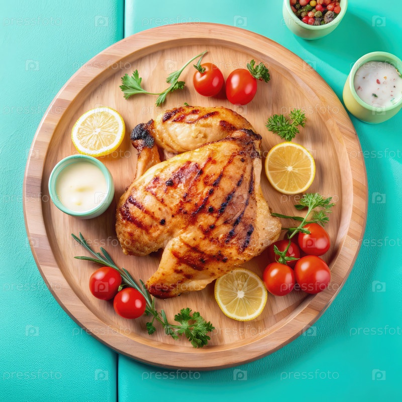 Горячая курица подается на деревянной тарелке с свежими овощами и травами