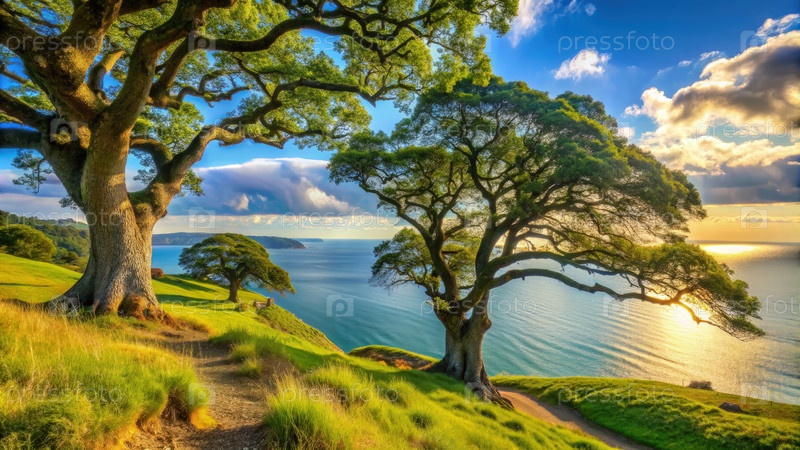 Вид на побережье с пышными деревьями и мягкими волнами при закате солнца возле земляного холма