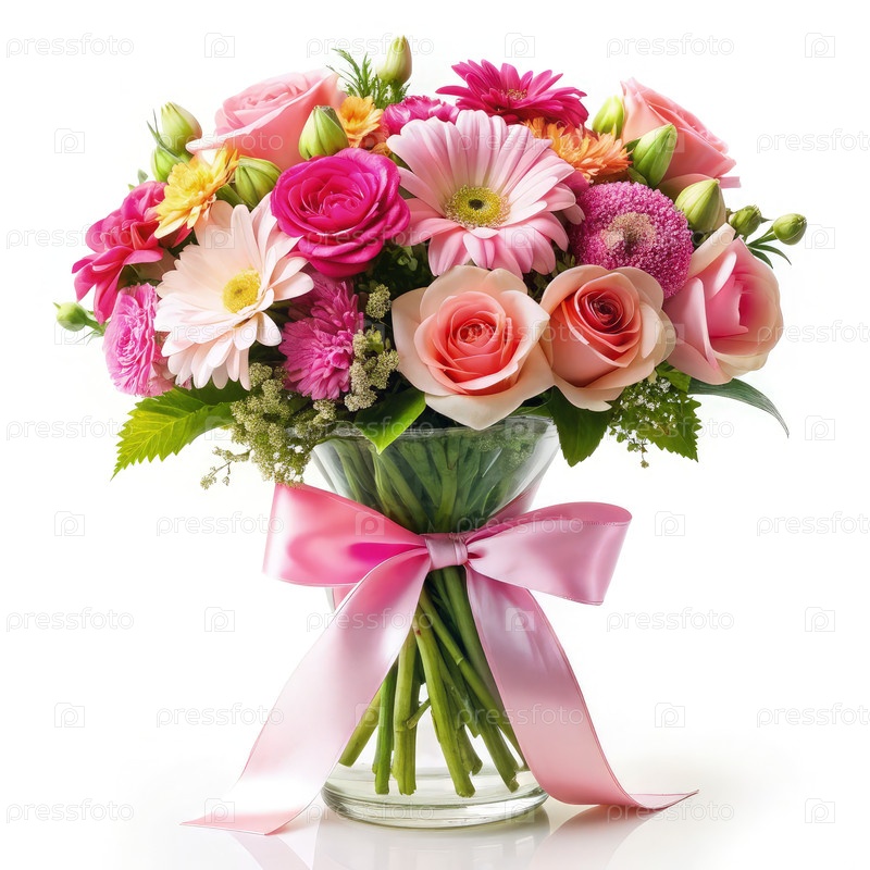 Красочный букет цветов в вазе, украшенной розовой ленточкой