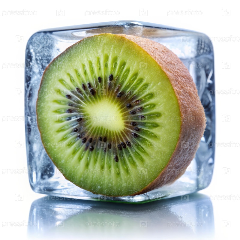 Близкий взгляд на кусочки киви, покрытые льдом на ярком фоне