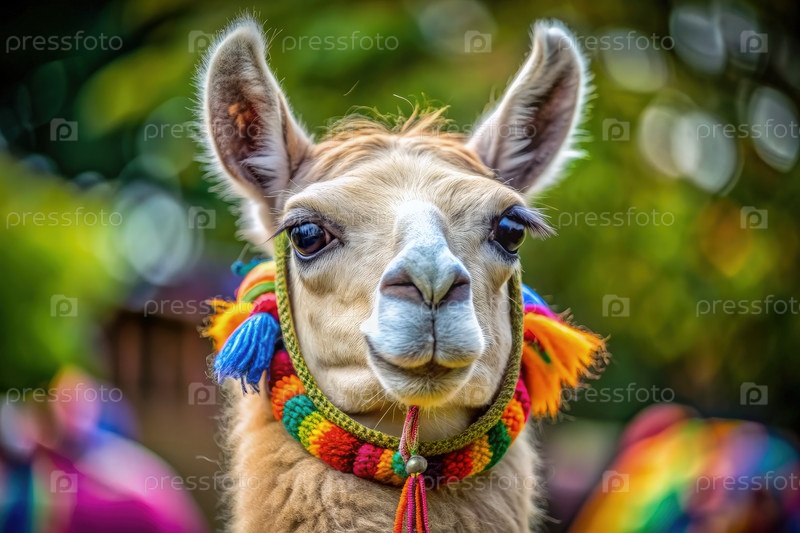 Близкий взгляд на причудливую ламу, украшенную красочным ручной ошейником в окружении яркой природной среды в солнечный день