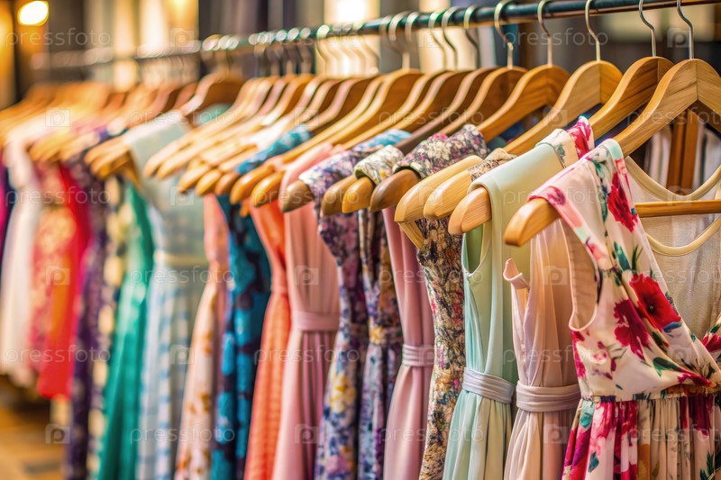 Ближайшее изображение красочных женских платьев, аккуратно висящих на деревянных вешальях в бутике в дневное время