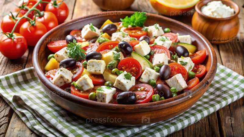 Свежий овощный салат с сыром фета и оливками, подаваемый на деревянном столе