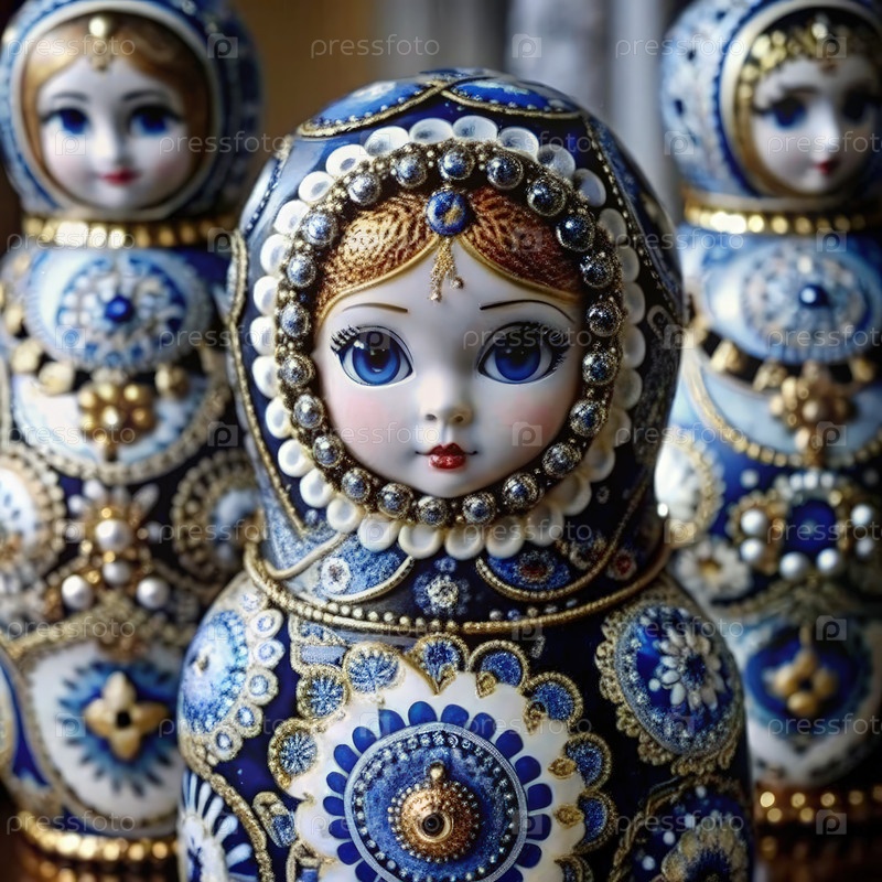 Декоративные куклы матриошки со сложными синими и золотыми рисунками на выставке