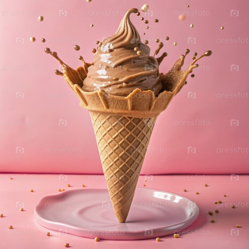 Очаровательное отображение красочного мороженого с богатым шоколадным соусом в солнечный день, включая конус вафли