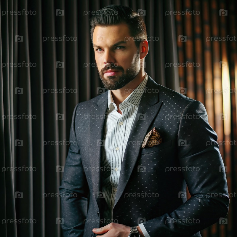 Стильный мужчина в формальном наряде позирует элегантно против драпированного фона в современной обстановке