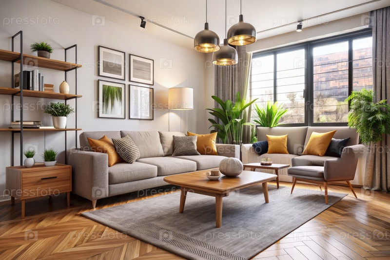 Современный дизайн гостиной с уютным серым диваном, декоративными подушками и естественным светом подчеркивает внутренние растения в городской квартире