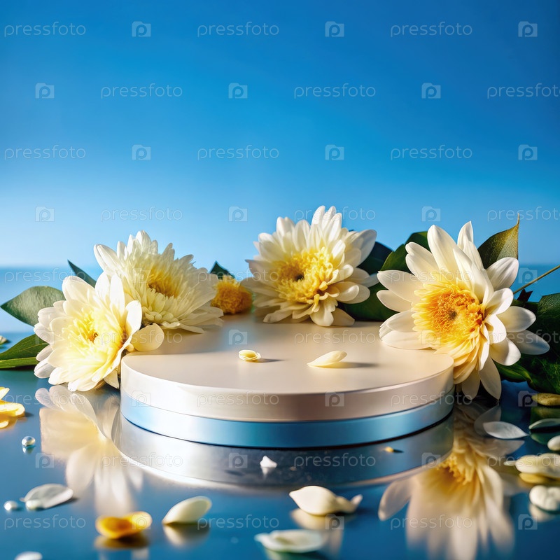 Светло-серый подиум, окруженный цветами на голубой стеклянной поверхности в яркой обстановке