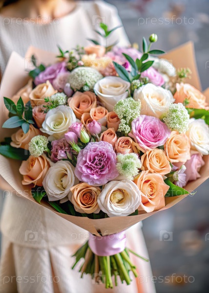 Красивый букет пастельных роз, который держит женщина в легком платье