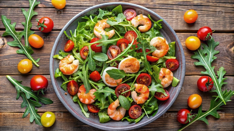 Свежий салат с ракетой, помидорами и креветками подается на деревянном столе в ярких цветах