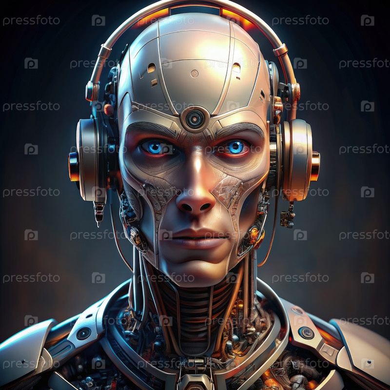 Человекоподобный робот с передовыми функциями и наушниками в футуристической обстановке