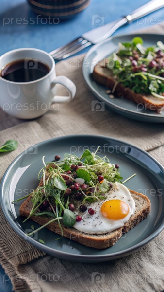 Очаровательная завтраковая тарелка с микрозелеными овощами ругулы, жареным яйцом и обжаренным хлебом, подаваемой рядом с кофе на обычном обеденном столе