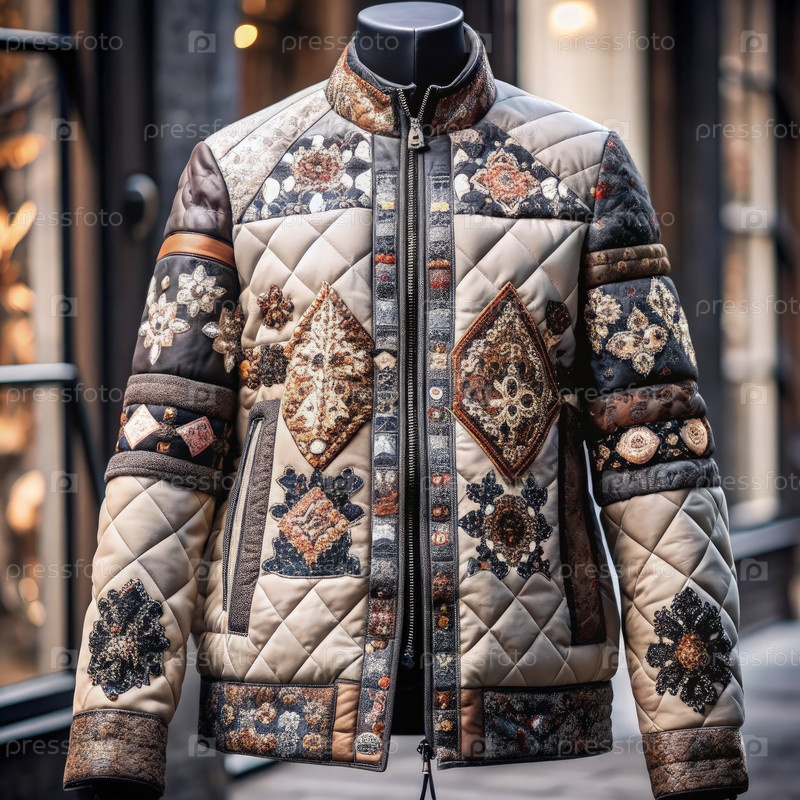 Замысловато спроектированная куртка из ковриков, выставленная на витрине бутикового магазина