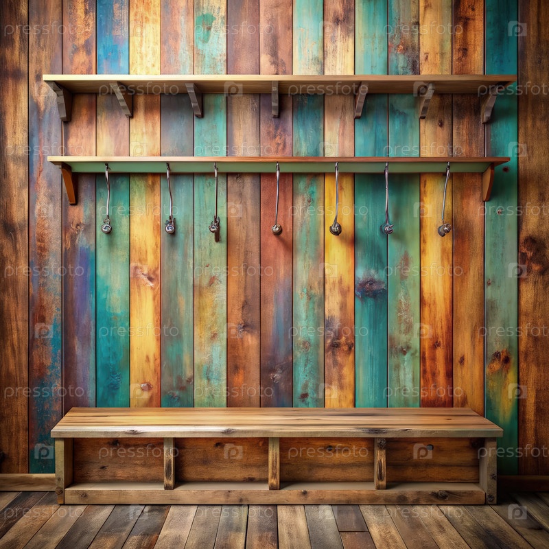 Красочная деревянная стена с крючками и скамейкой в уютном интерьере