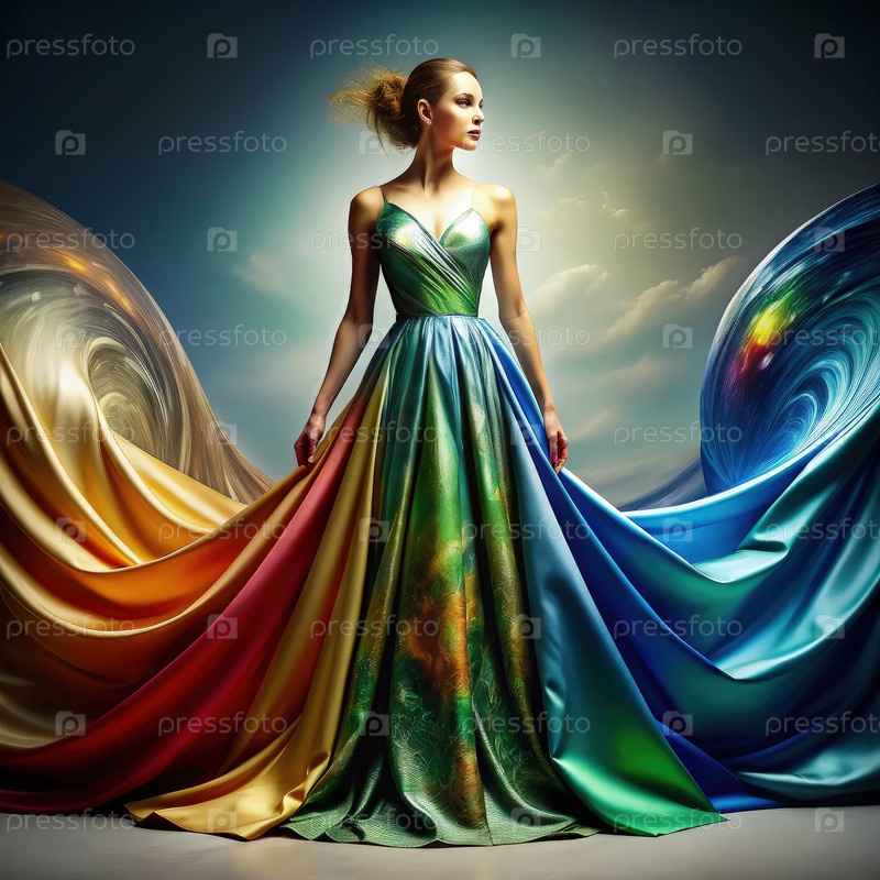Футуристический дизайн атласных платьев с яркими цветами и текучей тканью