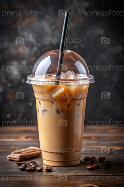Наслаждайтесь освежающим холодным латте со льдом, подаваемым в прозрачном пластиковом стакане с соломой рядом с печеньем и кофейными зернами на деревянном столе