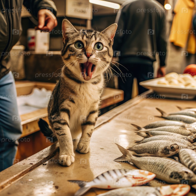 Кот крадет рыбу на киоске рыбопродавца в часы оживленного рынка