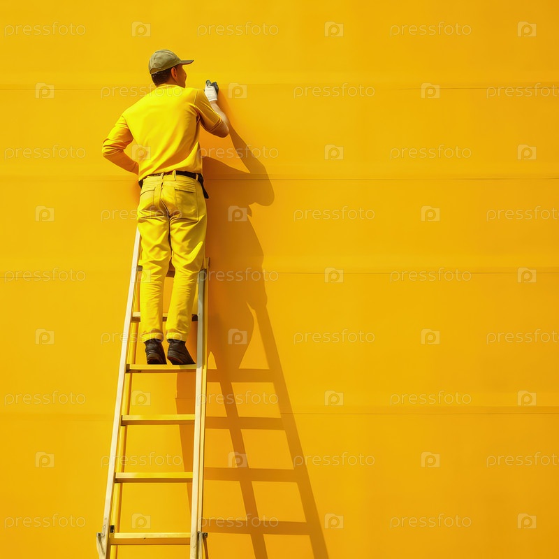 Художник на лестнице, прикладывающий желтую краску к высокой наружной стене в дневное время