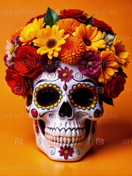 Вибрирующий мексиканский череп, украшенный красочными цветами на ярком фоне