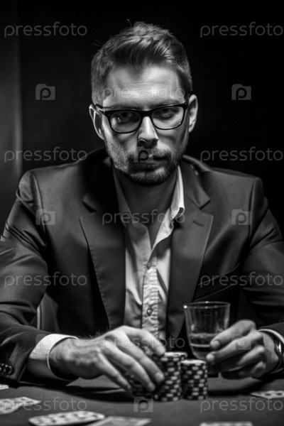 Человек в очках играет в покер за столом казино во время ночной игры