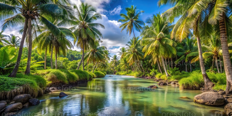 Спокойный тропический поток, окруженный пышными пальмами в солнечный день