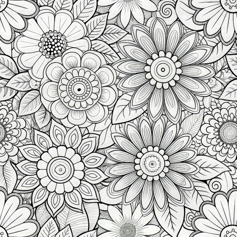 Черно-белый цветочный рисунок с сложными узорами различных цветов и листьев на стандартной бумаге