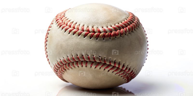 Классический бейсбольный мяч, опирающийся на отражающую поверхность, подчеркивает его сложные швы и изношенную текстуру в солнечный день