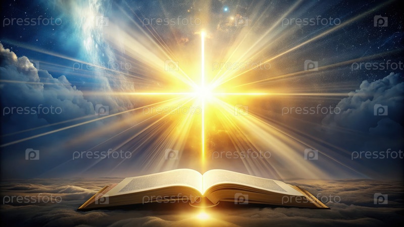 Священная книга, освещаемая ярким светом на небесном фоне