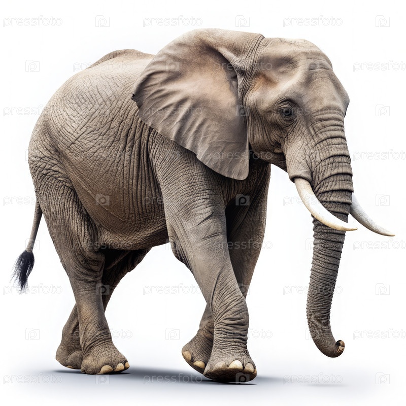 Слон гуляет изящно в боковом видении на чистом белом фоне в полдень
